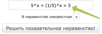 Решим показательное неравенство 5^x + (1/5)^x > 5 с помощью онлайн сервиса, который находится по ссылке