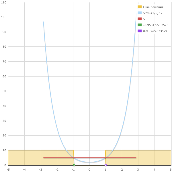 Дано неравенство: $$5^{x} + \left(\frac{1}{5}\right)^{x} > 5$$ Чтобы решить это нер-во - надо сначала решить соотвествующее ур-ние: $$5^{x} + \left(\frac{1}{5}\right)^{x} = 5$$ Решаем: