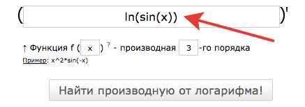Например, если надо найти производную натурального логарифма от синуса от x: ln(sin(x)) .