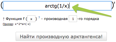 Например, если надо найти производную арктангенса от единицы, деленной на x: arctg(1/x) .