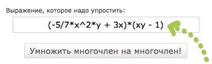 Произведём умножение многочлена на многочлен с помощью калькулятора упрощения любых выражений онлайн.
