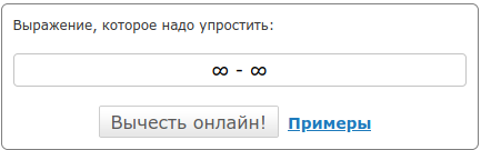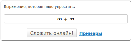 Этот сайт предоставляет возможность использовать символ бесконечности как для вычисления пределов и интегралов, но как и результат нахождения решений уравнений, пределов, исследования функций и др.