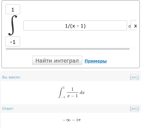 Но бесконечность может быть и результатом вычисления несобственного интеграла, для этой функции:
