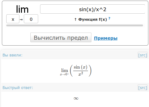 Также, бесконечность может быть результатом вычисления предела, например, для функции sin(x)/x^2 при x -> 0 результатом будет бесконечность.