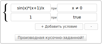 Для того, чтобы найти её производную, для начала введите её в форму для кусочно-заданных функций: