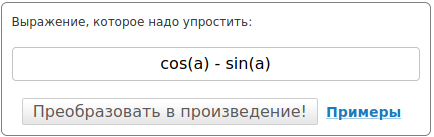 Рассмотрим примеры преобразования в произведение тригонометрических выражений онлайн: