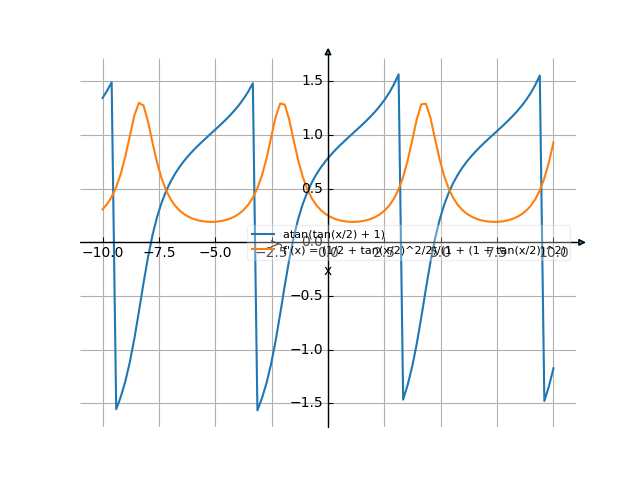 \ \ \2// / $$\frac{\left(\tan{\left(\frac{x}{2} \right)} - \frac{\left(\tan{\left(\frac{x}{2} \right)} + 1\right) \left(\tan^{2}{\left(\frac{x}{2} \right)} + 1\right)}{\left(\tan{\left(\frac{x}{2} \right)} + 1\right)^{2} + 1}\right) \left(\tan^{2}{\left(\frac{x}{2} \right)} + 1\right)}{2 \left(\left(\tan{\left(\frac{x}{2} \right)} + 1\right)^{2} + 1\right)}$$