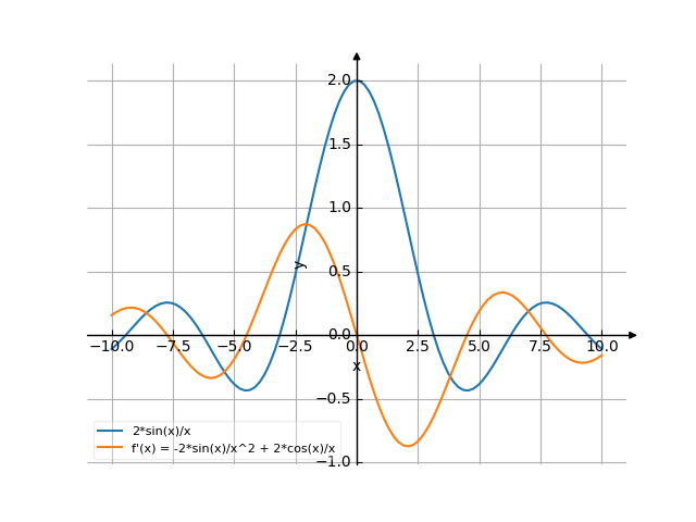 x ![Найти производную y' = f'(x) = 2*sin(x)/x (2 умножить на синус от (х) делить на х) - функции. Найдём значение производной функции в точке. [Есть ответ!] Производная 2*sin(x)/x /media/krcore-image-pods/hash/derivative/3/38/7580ddc251393144e848abd16ce48.png](/media/krcore-image-pods/hash/derivative/3/38/7580ddc251393144e848abd16ce48.png)