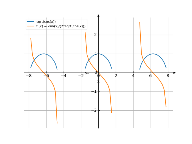 8*\/ cos(x) ![Найти производную y' = f'(x) = sqrt(cos(x)) (квадратный корень из (косинус от (х))) - функции. Найдём значение производной функции в точке. [Есть ответ!] Производная sqrt(cos(x)) /media/krcore-image-pods/hash/derivative/5/8e/d8d7ab0d088d2f4f63b65cdf10519.png](/media/krcore-image-pods/hash/derivative/5/8e/d8d7ab0d088d2f4f63b65cdf10519.png)