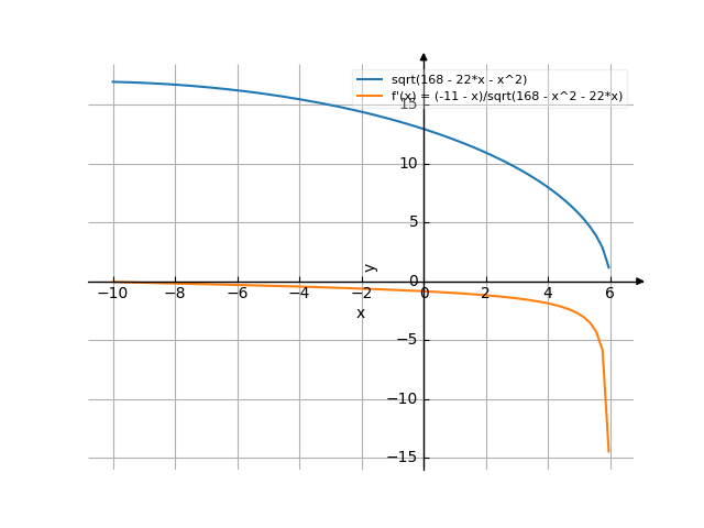 \168 - x - 22*x/ ![Найти производную y' = f'(x) = sqrt(168-22*x-x^2) (квадратный корень из (168 минус 22 умножить на х минус х в квадрате)) - функции. Найдём значение производной функции в точке. [Есть ответ!] Производная sqrt(168-22*x-x^2) /media/krcore-image-pods/hash/derivative/5/28/9254807572e3984e3c129e1742474.png](/media/krcore-image-pods/hash/derivative/5/28/9254807572e3984e3c129e1742474.png)
