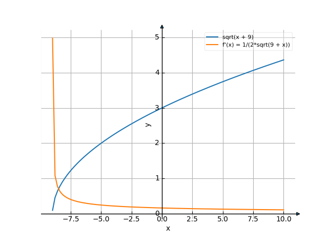 8*(9 + x) ![Найти производную y' = f'(x) = sqrt(x+9) (квадратный корень из (х плюс 9)) - функции. Найдём значение производной функции в точке. [Есть ответ!] Производная sqrt(x+9) /media/krcore-image-pods/hash/derivative/2/a7/282850db8f7ea46548c4c0129a5e6.png](/media/krcore-image-pods/hash/derivative/2/a7/282850db8f7ea46548c4c0129a5e6.png)