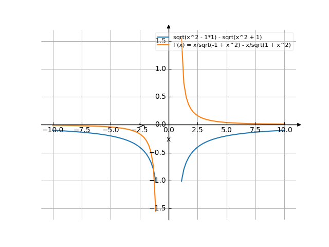 \\1 + x / \-1 + x / \-1 + x / \1 + x / /![Найти производную y' = f'(x) = sqrt(x^2-1)-sqrt(x^2+1) (квадратный корень из (х в квадрате минус 1) минус квадратный корень из (х в квадрате плюс 1)) - функции. Найдём значение производной функции в точке. [Есть ответ!] Производная sqrt(x^2-1)-sqrt(x^2+1) /media/krcore-image-pods/hash/derivative/f/fe/9a8edde391270f69e17220d7300a3.png](/media/krcore-image-pods/hash/derivative/f/fe/9a8edde391270f69e17220d7300a3.png)