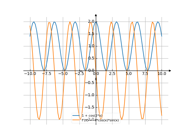 ![Найти производную y' = f'(x) = 1+cos(2*x) (1 плюс косинус от (2 умножить на х)) - функции. Найдём значение производной функции в точке. [Есть ответ!] Производная 1+cos(2*x) /media/krcore-image-pods/hash/derivative/f/9d/d6ca2774dcac2e5f458b3af75d6f8.png](/media/krcore-image-pods/hash/derivative/f/9d/d6ca2774dcac2e5f458b3af75d6f8.png)