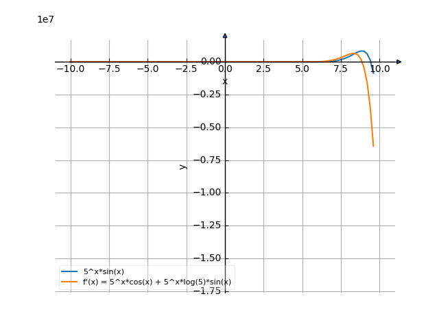 $$5^{x} \log{\left(5 \right)} \sin{\left(x \right)} + 5^{x} \cos{\left(x \right)}$$