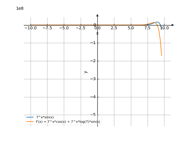 $$7^{x} \log{\left(7 \right)} \sin{\left(x \right)} + 7^{x} \cos{\left(x \right)}$$