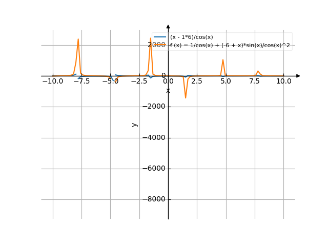 cos(x) ![Найти производную y' = f'(x) = (x-6)/cos(x) ((х минус 6) делить на косинус от (х)) - функции. Найдём значение производной функции в точке. [Есть ответ!] Производная (x-6)/cos(x) /media/krcore-image-pods/hash/derivative/8/65/9658e063d4e09b556548b521f646d.png](/media/krcore-image-pods/hash/derivative/8/65/9658e063d4e09b556548b521f646d.png)