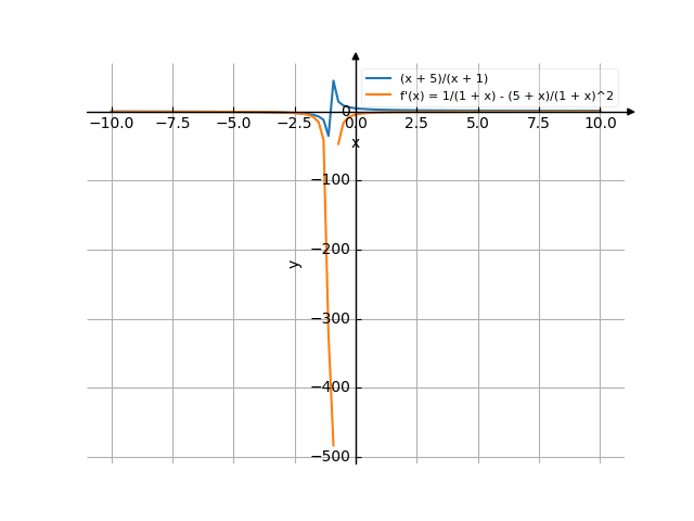 (1 + x) ![Найти производную y' = f'(x) = (x+5)/(x+1) ((х плюс 5) делить на (х плюс 1)) - функции. Найдём значение производной функции в точке. [Есть ответ!] Производная (x+5)/(x+1) /media/krcore-image-pods/hash/derivative/2/70/13796fe5c4b0574a0cc7c608f1736.png](/media/krcore-image-pods/hash/derivative/2/70/13796fe5c4b0574a0cc7c608f1736.png)