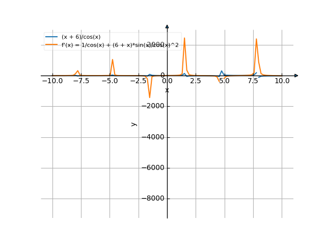 cos(x) ![Найти производную y' = f'(x) = (x+6)/cos(x) ((х плюс 6) делить на косинус от (х)) - функции. Найдём значение производной функции в точке. [Есть ответ!] Производная (x+6)/cos(x) /media/krcore-image-pods/hash/derivative/c/c8/4989c1067df33a0b4ae16ce8c1500.png](/media/krcore-image-pods/hash/derivative/c/c8/4989c1067df33a0b4ae16ce8c1500.png)